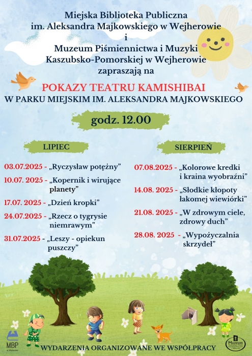 W miesiącach wakacyjnych, dzięki wspólnej inicjatywie Miejskiej Biblioteki Publicznej oraz Muzeum Piśmiennictwa i Muzyki Kaszubsko-Pomorskiej, w Parku Miejskim w Wejherowie odbywać się będą przedstawienia teatrzyku kamishibai.