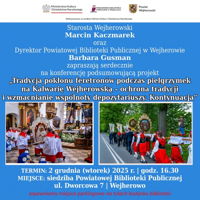 W najbliższy wtorek, 2 grudnia br. o 17:00 w siedzibie Powiatowej Biblioteki Publicznej w Wejherowie odbędzie się konferencję podsumowującą projekt: "Tradycja pokłonu feretronów podczas pielgrzymek na Kalwarię Wejherowską – ochrona tradycji i wzmacnianie wspólnoty depozytariuszy. Kontynuacja".
