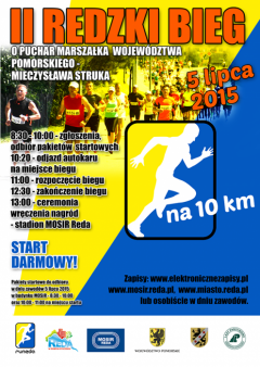 Imprezy sportowe związana z Dniami Redy 2015 odbędą się w niedzielę 5 lipca. II Bieg Redzki na dystansie 10 km., o puchar Marszałka Województwa Pomorskiego Mieczysława Struka, rozpocznie się i godzinie 11:00. Organizatorzy spodziewają się kilkusetosobowej frekwencji. Zapisy na bieg można dokonać poprzez elektroniczną platformę: www.elektronicznezapisy.pl do dnia 29 czerwca, albo w dniu zawodów godzinach 8:30 – 10:00 w Biurze Zawodów w siedzibie redzkiego MOSiR-u. Uczestnictwo w biegu jest bezpłatne.
