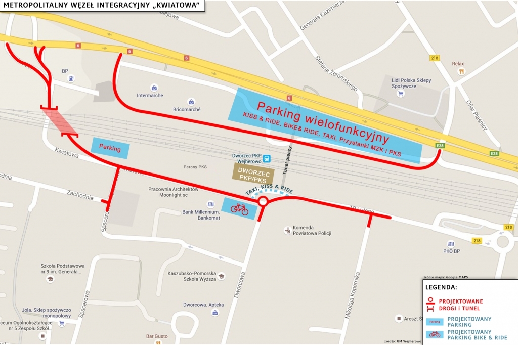 Węzeł "Kwiatowa" to nie tylko tunel pod torami kolejowymi zapewniający bezkolizyjną komunikację pomiędzy północną a południową częścią Wejherowa, ale również parkingi dla samochodów i rowerów, przystanki MZK i PKS, postoje TAXI zapewniające integrację różnych form transportu z SKM i PKP.