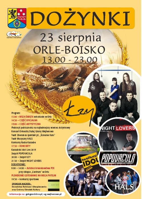 Już w najbliższą niedzielę 23 sierpnia odbędą się dożynki w gminie Wejherowo. Uroczystości rozpoczną się o godzinie 13:00 uroczystą Mszą Świętą w kościele pod wezwaniem św. Piotra i Pawła w Orlu. Po nabożeństwie korowód dożynkowy uda się na boisko sportowe gdzie odbędą się oficjalna część uroczystości, a od godziny 15:00 rozpocznie się wspólna zabawa.