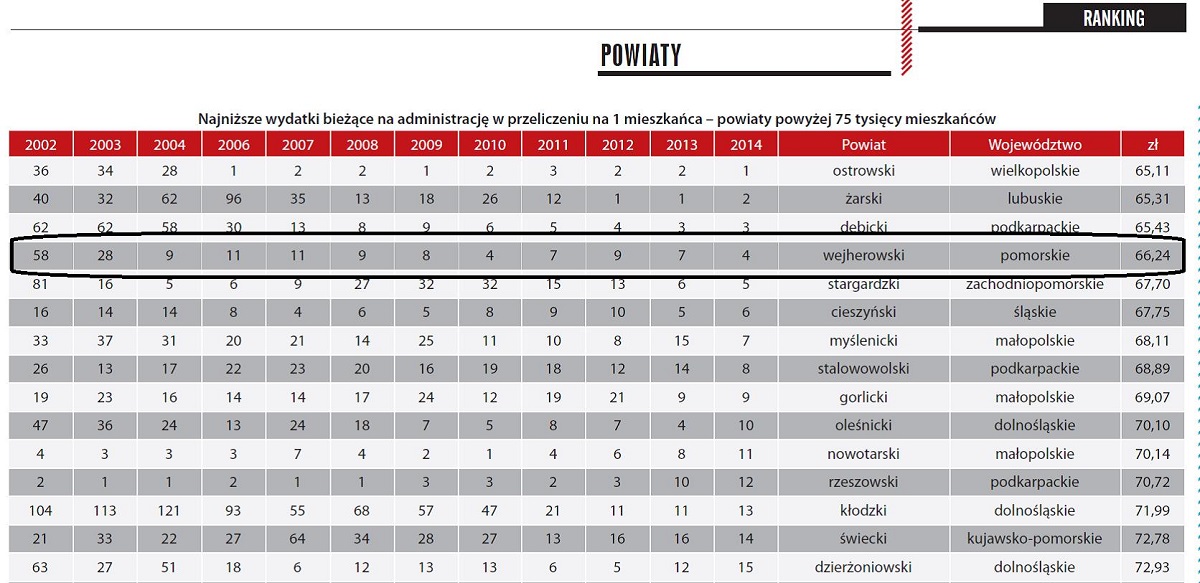 W najnowszym zestawieniu Powiat Wejherowski został sklasyfikowany na czwartym miejscu wśród powiatów o liczbie mieszkańców powyżej 75 tysięcy, w kategorii wydatków bieżących na administrację w przeliczeniu na jednego mieszkańca w 2014 roku.