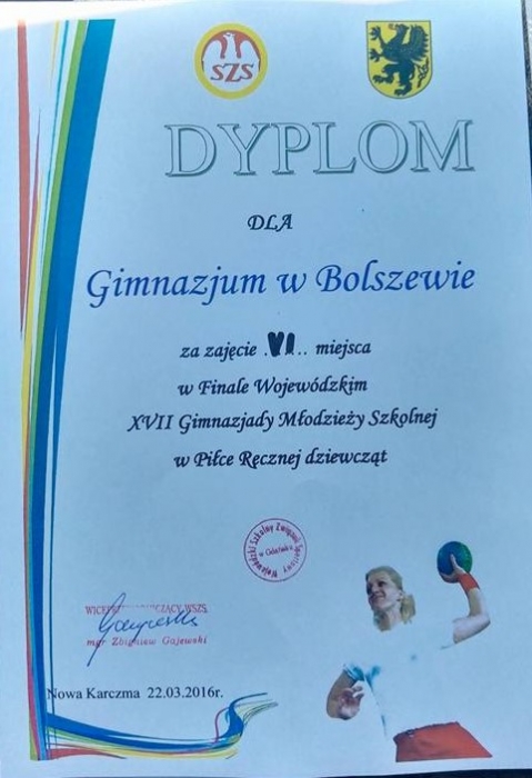 W Wojewódzkim Finale jaki rozegrano 22 marca w Nowej Karczmie oprócz dziewcząt z Samorządowego Gimnazjum w Bolszewie i gospodyń z Nowej Karczmy, wystąpiły także gimnazjalistki z Kwidzyna, Ustki, Tczewa i Gdańska. Nasze zawodniczki walczyły jak lwice ale musiały ulec rywalkom które zaprezentowały lepsze wyszkolenie techniczne, zmysł taktyczny i przygotowanie wytrzymałościowe. Ostatecznie szczypiornistki z Bolszewa zajęły w turnieju finałowym 6 miejsce. Zwyciężyła drużyna z Nowej Karczmy.