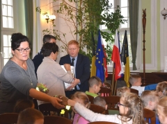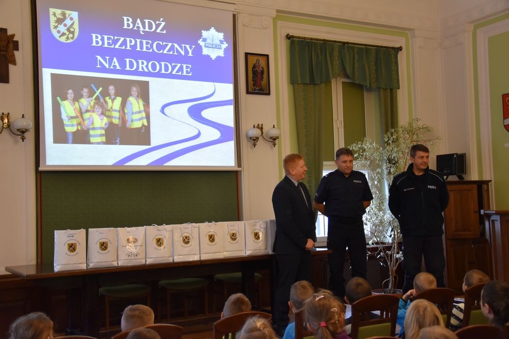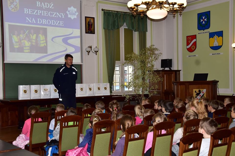 W sali narad Starostwa Powiatowego w Wejherowie odbyło się spotkanie profilaktyczne policjantów z Komendy Powiatowej Policji w Wejherowie z uczniami Szkoły Podstawowej nr 9. Podczas spotkania przedstawiciele starostwa przekazali na ręce funkcjonariuszy odblaski, które trafią do najmłodszych mieszkańców powiatu w trakcie pogadanek o bezpieczeństwie na drodze. Odblaskowe elementy noszone przy plecakach i odzieży zewnętrznej mają przyczynić się do poprawy widoczności pieszych, szczególne po zmroku.