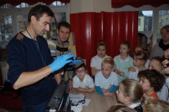 W środę o godz. 9:00 policjanci z wejherowskiej Komendy Powiatowej Policji odwiedzili Powiatową Bibliotekę Publiczną w Wejherowie, w której przebywały dzieci ze szkoły podstawowej uczestniczące w zajęciach zorganizowanych przez Bibliotekę. Funkcjonariusze opowiadali dzieciom o swojej pracy, a szczególne zaciekawienie dzieci wzbudził pokaz przygotowany przez techników kryminalistyki, którzy zaznajomili najmłodszych z zawartością używanej podczas czynności na miejscu zdarzenia walizki śledczej, a także przeprowadzili pokaz daktyloskopii oraz zabezpieczania innych śladów kryminalistycznych na miejscu przestępstwa.