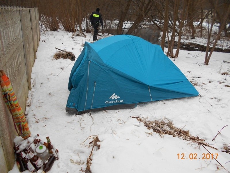 O rozbitym nad rzeką namiocie w dniu 12 lutego roku Straż Miejską powiadomili okoliczni mieszkańcy, myśląc, że nad rzeką zamieszkali bezdomni. Podczas kontroli w ciągu dnia, nikogo nie zastano, chociaż oględziny jasno dowodziły że jest on zamieszkany. W namiocie znajdowała się kołdra, poduszka, a na zewnątrz znajdował się plażowy parawan.