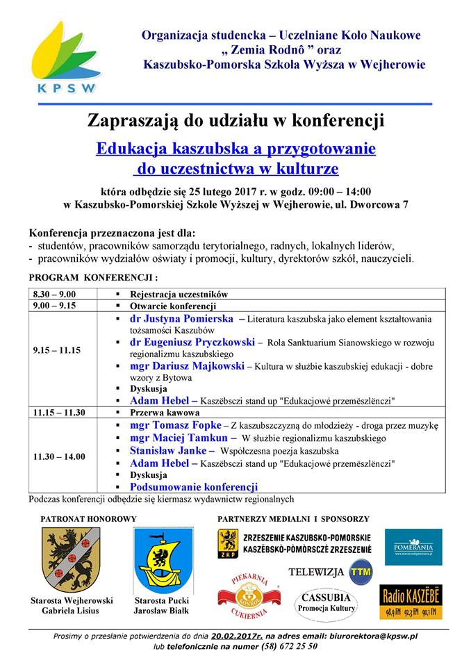 Konferencja odbędzie się w sobotę 25 lutego w godzinach 9:00 – 14:00 w budynku KPSW w Wejherowie przy ul. Dworcowej 7. Wśród prelegentów są między innymi: dr Justyna Pomierska, dr Eugeniusz Pryczkowski, mgr Dariusz Majkowski, mgr Tomasz Fopke, mgr Maciej Tamkun, oraz Stanisław Janke i Adam Hebel, którzy wygłoszą przygotowane przez siebie referaty. Program konferencji przewiduje także dyskusje. Szczegółowy program wydarzenia w załączeniu.