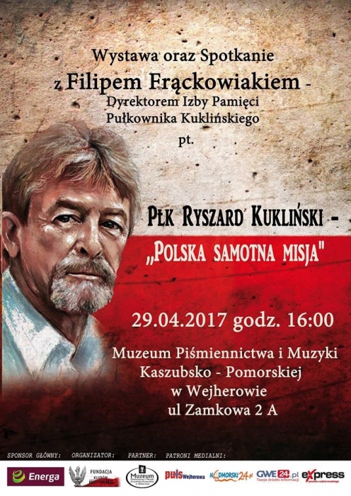 Planszowa ekspozycja prezentująca życiorys Ryszarda Kuklińskiego jego bohaterską misję, wraz ze Stanami Zjednoczonymi, powstrzymania wojennych planów Związku Sowieckiego w latach 70. i 80. XX wieku, będziemy mogli obejrzeć w sobotę 29 kwietnia w Muzeum Piśmiennictwa i Muzyki Kaszubsko-Pomorskiej, ul. Zamkowa 2a. Wraz z wystawą, o godzinie 16:00 odbędzie się spotkanie z Filipem Frąckowiakiem Dyrektorem Izby Pamięci Pułkownika Kuklińskiego.