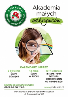 Spotkanie pt. "Świat w ruchu" z cyklu "Akademia Małych Odkrywców" odbędzie się 14 maja w Porcie Rumia Centrum Handlowym Auchan przy ulicy Grunwaldzkiej 108, w pasażu galerii. Będzie trwało od 12:00 do 17:00.