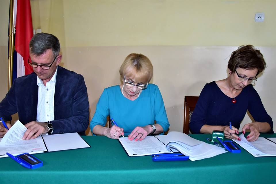 W piątek 2 czerwca br. w siedzibie szkoły, w obecności władz powiatu oraz młodzieży szkolnej, uroczyście podpisano umowę na budowę hali. W imieniu szkoły podpis złożyła dyrektor Anna Wilk, a wykonawcę - firmę WOJ-MAR reprezentował Mariusz Gustowski i Krystyna Kanasz.