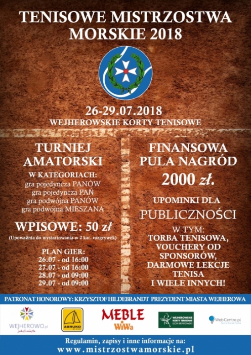 Turniej odbędzie się w dniach 26 – 29 lipca 2018 r. na wejherowskich kortach przy ul. Kalwaryjskiej. Zapisy oraz szczegółowe informacje na temat zawodów dostępne są na stronie internetowej organizatora: www.mistrzostwamorskie.pl.