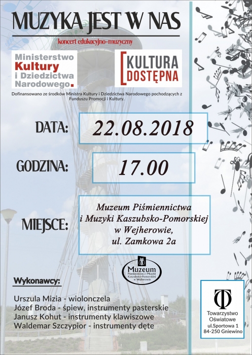 Na koncert "Muzyka jest w nas" zaprasza Towarzystwo Oświatowe w Gniewinie wraz z Muzeum Piśmiennictwa i Muzyki Kaszubsko-Pomorskiej w Wejherowie. W programie przedstawione zostaną utwory znanych polskich kompozytorów takich jak: F. Chopin, J. Padarewski, S. Moniuszko, oraz regionalnych: J. Trepczyk, A. Pelpliński, T. Fopke, J. Sztwirtnia, J. Kohut. Wykonane zostaną również melodie ludowe z Beskidu Śląskiego, Beskidu Żywieckiego oraz Kaszub.