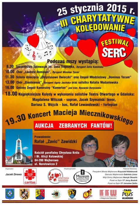 W parafii p.w. Chrystusa Króla i bł. Alicji Kotowskiej w Wejherowie odbędzie się wspólne kolędowanie pod nazwą "Festiwal Serc". Akcja charytatywna, w której udział weźmie między innymi Maciej Miecznikowski, ma na celu pomoc dzieciom.