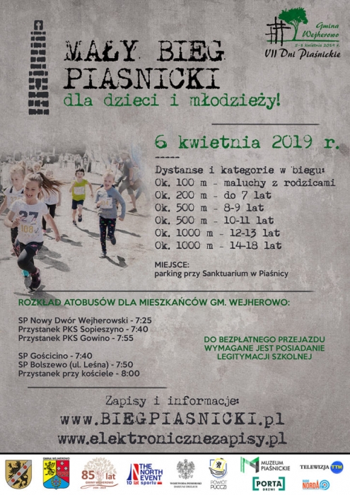 Wcześniej rozegrane zostaną imprezy biegowe dla dzieci, młodzieży i dorosłych. Biuro zawodów XI Biegu Piaśnickiego znajdować się będzie na parkingu przy Sanktuarium w Piaśnicy i czynne będzie od godziny 8:00. Po rejestracji i odebraniu pakietów startowych uczestnicy biegu głównego na dystansie 10 km zostaną przewiezieni na miejsce startu, pod Bramę Piaśnicką w Wejherowie przy ul. Ofiar Piaśnicy. Start nastąpi o 10:30. Biegi dla dzieci i młodzieży rozpoczną się około godziny 9:00. Miejscem startu będzie parking leśny w Piaśnicy.