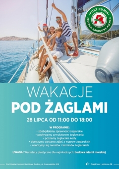 Atrakcje pod hasłem "Wakacje pod żaglami" odbędą się w niedzielę 28 lipca w Porcie Rumia Centrum Handlowym Auchan przy ulicy Grunwaldzkiej 108 w Rumi. Zajęcia i zabawy będą dostępne od godziny 11:00 do 18:00. Udział w wydarzeniu jest bezpłatny.