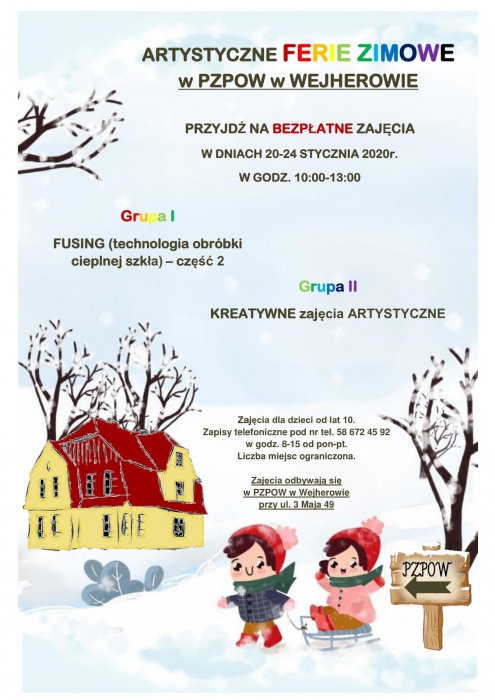 Wzorem lat ubiegłych w dniach 20 – 24 stycznia br. rozpoczną się "Artystyczne Ferie". Zajęcia, przeznaczone dla dzieci w wieku od 10 lat, odbędą się w dwóch grupach. Grupa pierwsza – fusing (technologia obróbki cieplnej szkła), grupa druga – kreatywne zajęcia artystyczne. Wszystkie warsztaty odbywać się będą w siedzibie PZPOW w Wejherowie przy ul. 3 Maja 49 w godzinach 10:00 – 13:00.