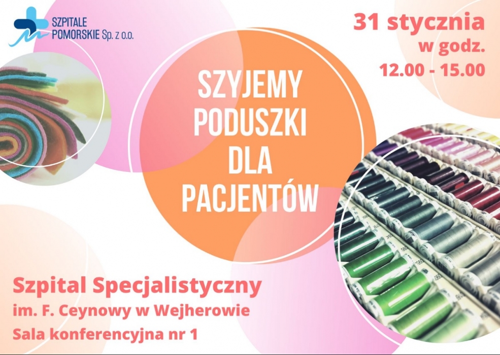W ramach akcji charytatywnej, przy aktywnym wsparciu wolontariuszu w najbliższy piątek, 31 stycznia, w godzinach 12:00-15:00 odbędzie sie wspólne szycie poduszek dla pacjentów Szpitala Specjalistycznego im. F. Ceynowy w Wejherowie