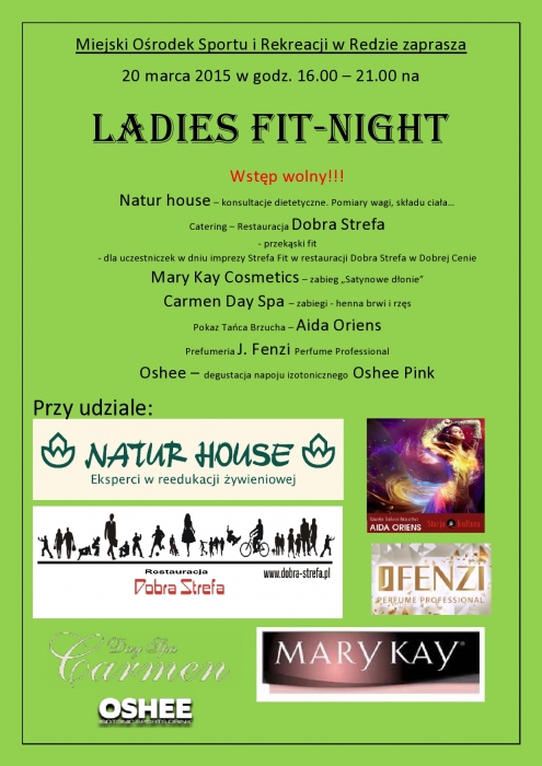 Ladies Fit-Night rozpocznie się o godzinie 16:00 w siedzibie Miejskiego Ośrodka Sportu i Rekreacji w Redzie, przy ul. Łąkowej 59. Organizator przygotował moc atrakcji dla Pań, ale i Panowie nie powinni być zawiedzeni. W tym dniu będzie można wysłuchać prelekcji oraz skorzystać z indywidualnych porad dietetyczki z Nature House. Swoje usługi zaprezentują firmy kosmetyczne: Mary Kay Cosmetics – zabiegi "satynowe dłonie" oraz Carmen Day Spa – henna brwi i rzęs. Perfumeria J. Fenzi zaprezentuje swoje zapachy. Około godziny 18:00 pokaz tańca brzucha w wykonaniu Aida Oriens.