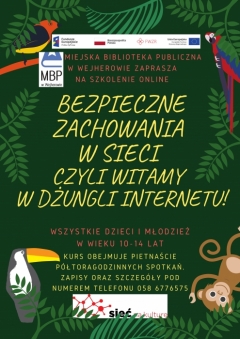 Biblioteka proponuje swoim młodym czytelnikom udział w projekcie "Bezpieczne zachowania w sieci, czyli witamy w dżungli Internetu!". Będzie to bezpłatny cykl zajęć on-line, których celem jest edukacja w zakresie bezpieczeństwa działań oraz zachowań w sieci dla dzieci w wieku 10-14 lat. Wśród poruszanych tematów znajdą się między innymi skuteczne metody reagowania na zagrożenia wynikające z korzystania z Internetu. Ilość miejsc dla uczestników projektu jest mocno ograniczona. Zgłoszenia należy wysłać do 24 marca na adres: jozefina.o@biblioteka.wejherowo.pl. Decyduje kolejność zgłoszeń. Projekt współfinansowany jest z Europejskiego Funduszu Rozwoju Regionalnego w ramach Programu Operacyjnego Polska Cyfrowa.