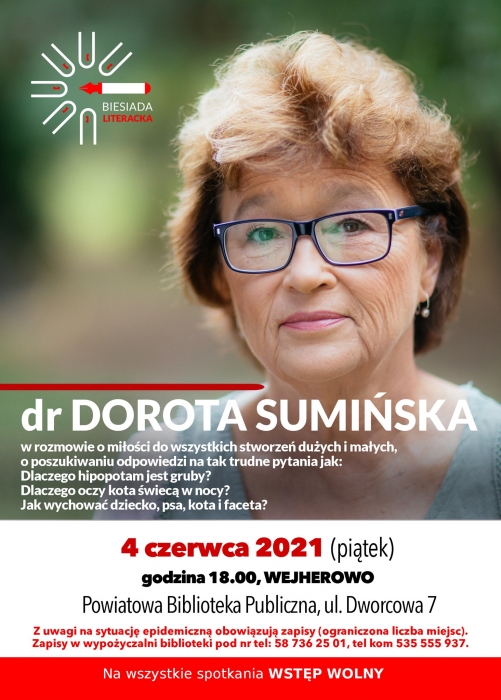 W najbliższy piątek 4 czerwca o godzinie 18:00 w Powiatowej Bibliotece Publicznej w Wejherowie przy ul. Dworcowej 7, w ramach cyklu Biesiady Literackie, w rozmowie o stworzeniach małych i dużych, odbędzie się spotkanie z dr Dorotą Sumińską. Z uwagi na sytuację epidemiczną, obowiązują zapisy - ilość miejsc ograniczona. Chętni mogą się zapisywać w wypożyczalni biblioteki pod nr tel.: 58 637 25 01 lub 535 555 937.