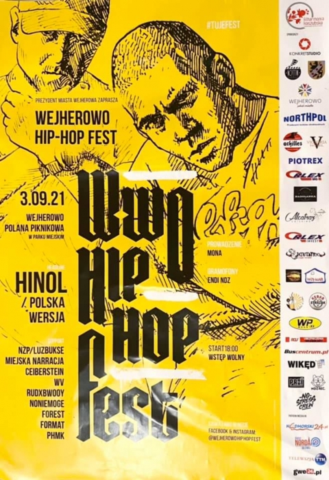 Wejherowo Hip Hop Fest odbędzie się w piątek 3 września na Polanie Piknikowej w Parku Miejskim (obok amfiteatru). Początek o godzinie 18:00. Na scenie pojawiać się będą kolejno: