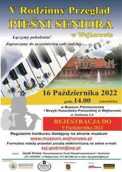 Muzeum Piśmiennictwa i Muzyki Kaszubsko-Pomorskiej wraz ze Stowarzyszeniem Wsparcia Osób Niepełnosprawnych i Seniorów "Żyj godnie" z Wejherowa, zapraszają na V Rodziny Przegląd Pieśni Seniora. Celem imprezy, oprócz propagowania muzyki chóralnej oraz podnoszenie poziomu wykonawczego amatorskich zespołów wokalnych i solistów, jest także aktywizacja seniorów w zakresie kultury muzycznej oraz integracja grup seniorów i osób niepełnosprawnych.