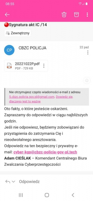 Przestępcy rozsyłają maile podszywając się pod Komendanta Głównego Policji, wykorzystują również wizerunek Centralnego Biura Zwalczania Cyberprzestępczości oraz innych jednostek Policji, grożąc zatrzymaniem, aresztowaniem i odpowiedzialnością karną. Z treści fałszywych wiadomości wynika, że wobec osoby która go otrzymała toczy się postępowanie w związku z popełnieniem przestępstwa i należy zapoznać się z zarzutami, które uszczegółowione są w załączniku do wiadomości. Jednocześnie w treści wiadomości pojawia się groźba, że jeżeli osoba nie zapozna się z zarzutami, to w ciągu kilku najbliższych godzin może zostać zatrzymana i aresztowana.